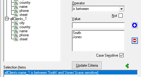 The following image shows a selection item where the selection criterion is all client names between Smith and Jones.