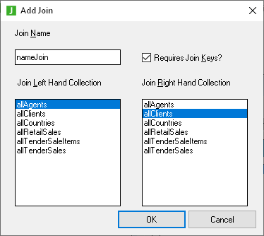 Select a collection to join in the Join Left Hand Collection list box and then select the collection to which it is to join in the Join Right Hand Collection list box.