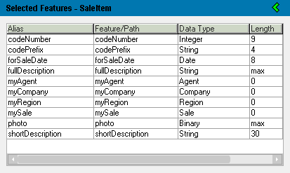 The following image shows the Selected Features pane after selecting all of the features from the SaleItem class.