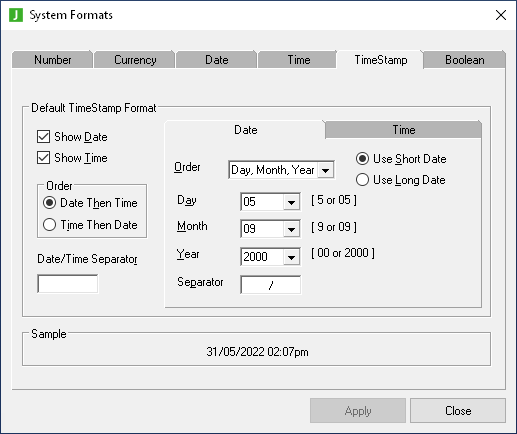 Click the Apply button to apply the changes that you have made or click the Close button to close the System Formats dialog.