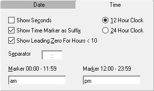 For the 12‑hour clock format, the default time markers are am and pm. You can change these, by using the Marker text boxes, described later in this instruction.