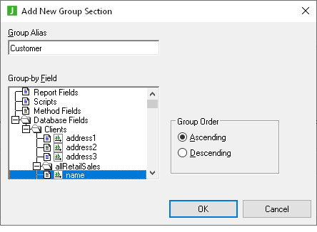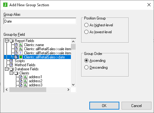 In the example in the above image, the field Clients::name is selected. In this case, the group is created before report fields are placed in the report design. When the report is run, the group footer is printed for the current client and the group header is printed for the next client each time the client (customer) name changes.