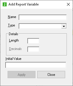 Click the Apply button to complete the creation of the report variable. Alternatively, click the Close button without clicking the Apply button to abandon your entries.