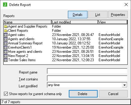 Select the Delete Report command from the File menu. The Delete Report dialog, shown in the following image, is then displayed.