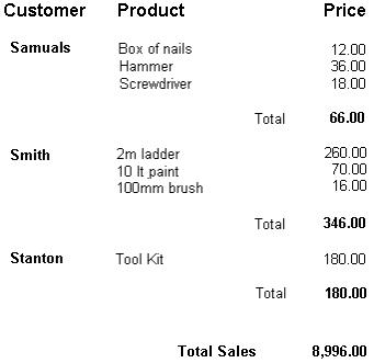 In this example, the product and price are printed repetitively until a change of group is encountered, at which point a group footer is printed with a group total. The grouping is on customer. A report footer is printed containing the report total at the end of the report. Group sections, group headers and footers, and the report footer are described later in this section.