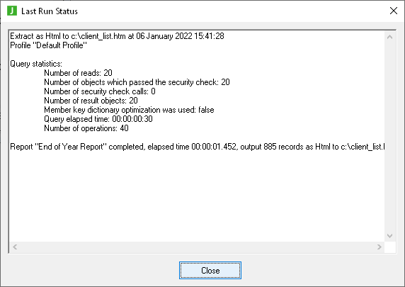 Details, including query statistics, of the last report run are displayed in the dialog.