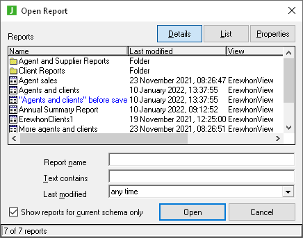Select the report that you want to open from the Reports list box or enter the name in the Report name text box.