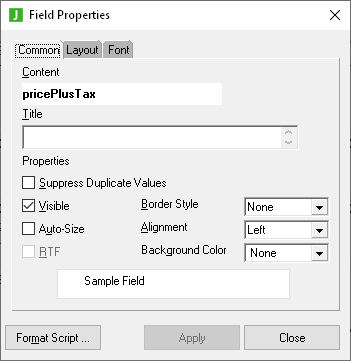 Select the Properties command from the popup menu. Alternatively, double‑click a report field. The Field Properties dialog, shown in the following image, is then displayed.
