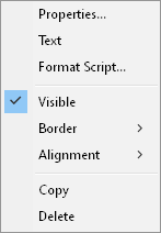Each popup menu provides commands that set common properties (for example, the Visible, Border, and Alignment commands shown in the previous image) and each popup menu provides a Delete command.