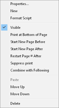Report sections are created with default properties that you can change by using the Section Properties dialog. You can also change some section properties by using commands that you access directly from the right‑click popup menu without displaying the Properties dialog. You can change section properties in advance of any physical design or you can change them at any time during the design process.