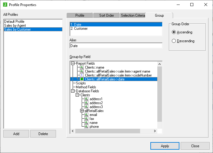 If you make group changes based on profiles, you can run any version of your report by specifying a unique profile name for each version. For example, one profile can produce your report in ascending group sequence and you can then specify another profile to print the report in descending sequence. You can also specify a different Group by Field field and therefore change the entire grouping sequence. Update report groups by using the Group sheet of the Profile Properties dialog.