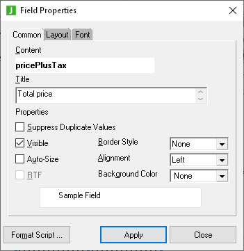 Click the Apply button to apply the changes that you have made or click the Close button to close the Field Properties dialog.