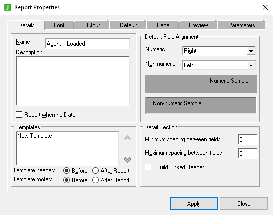 Use the Details sheet of the Report Properties dialog to apply a report description and to change the default values for field alignment and spacing.