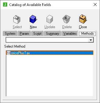 The Methods sheet of the Catalog of Available Fields dialog enables you to create method fields.