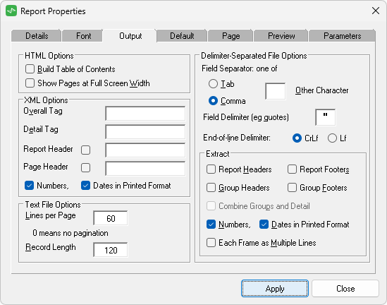 Use the Output sheet of the Report Properties dialog to set options that apply to data extract files. You can extract data files in the following formats.