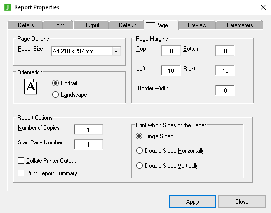 Click the Apply button to apply the changes you have made or click the Close button to close the Report Properties dialog.