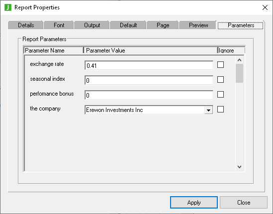 Use the Parameters sheet of the Report Properties dialog to set report parameters prior to previewing a report.