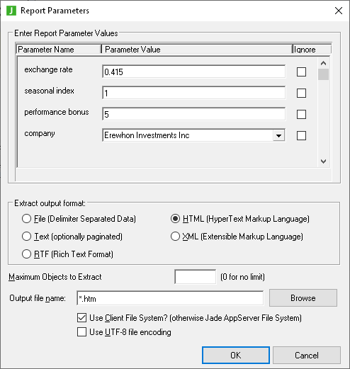 To specify that the output file path and file name specified in the Output file name text box is specified from the perspective of the local (client) workstation, check the Use Client File System check box. If you do not check this box, the output file path and file name is treated as specified from the perspective of the application server. By default, the output file uses the file system of the client workstation.
