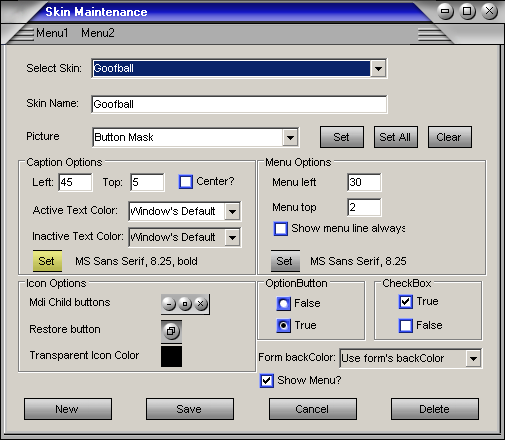 The following image shows the Skin Maintenance form (with a skin applied) that is displayed when you invoke the JadeSkinMaint form in your runtime applications, to enable a runtime user to define or maintain a skin that is available for selection in the application (based on the picture files that you have provided for each of the images).
