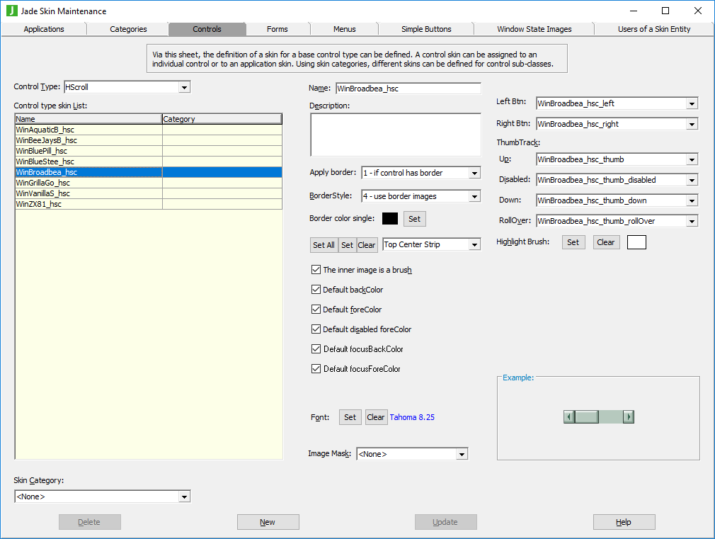 The list of control skins for the horizontal scroll bar control is then displayed in the Control type skin List table.