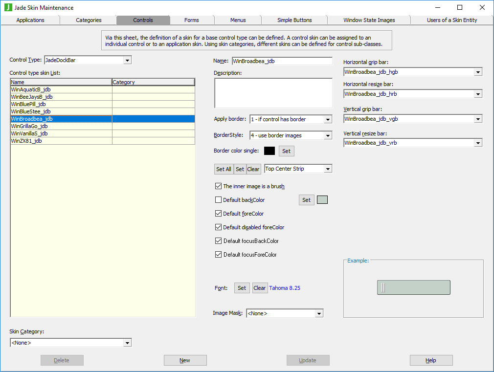 The list of control skins for the JadeDockBar control is then displayed in the Control type skin List table.