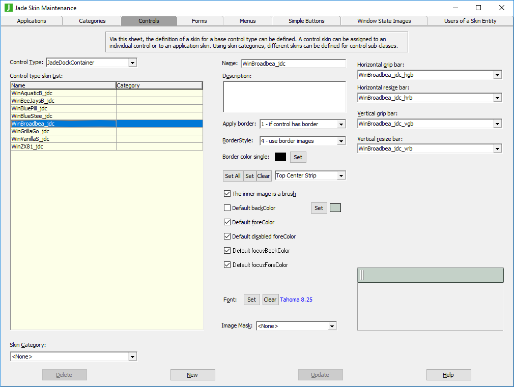 The list of control skins for the JadeDockContainer control is then displayed in the Control type skin List table.