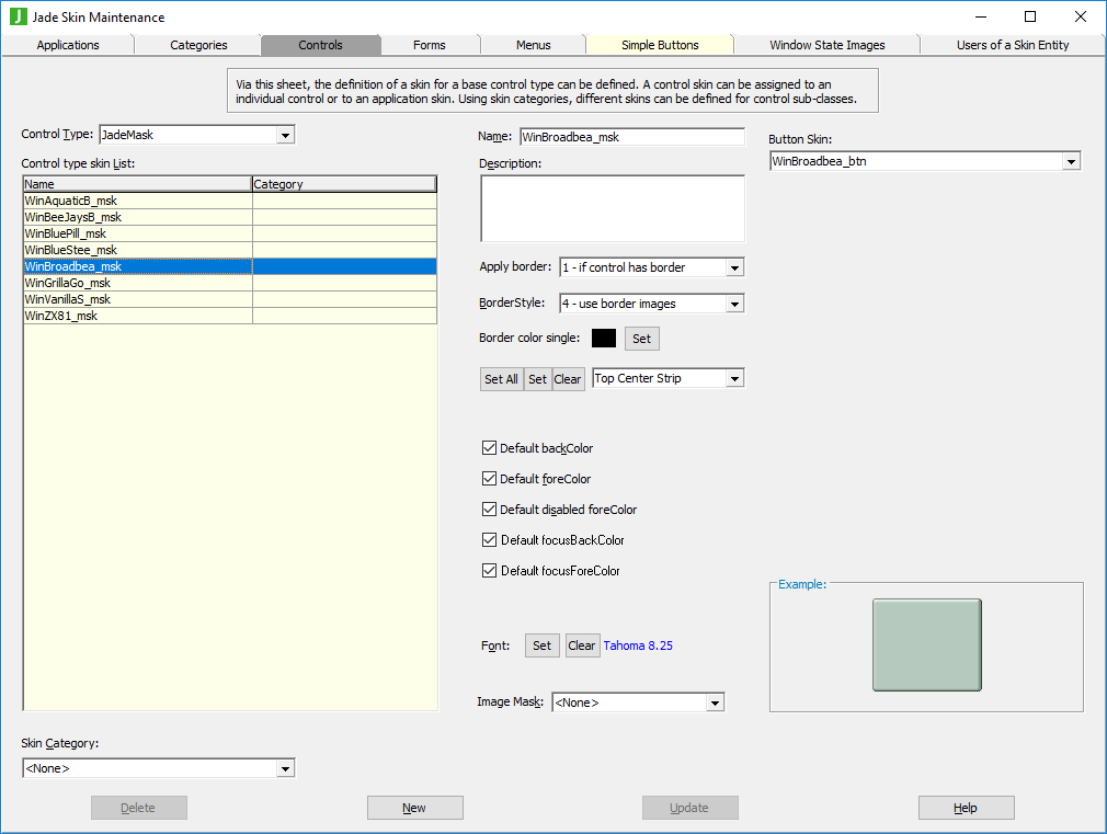 The list of control skins for the JadeMask control is then displayed in the Control type skin List table.