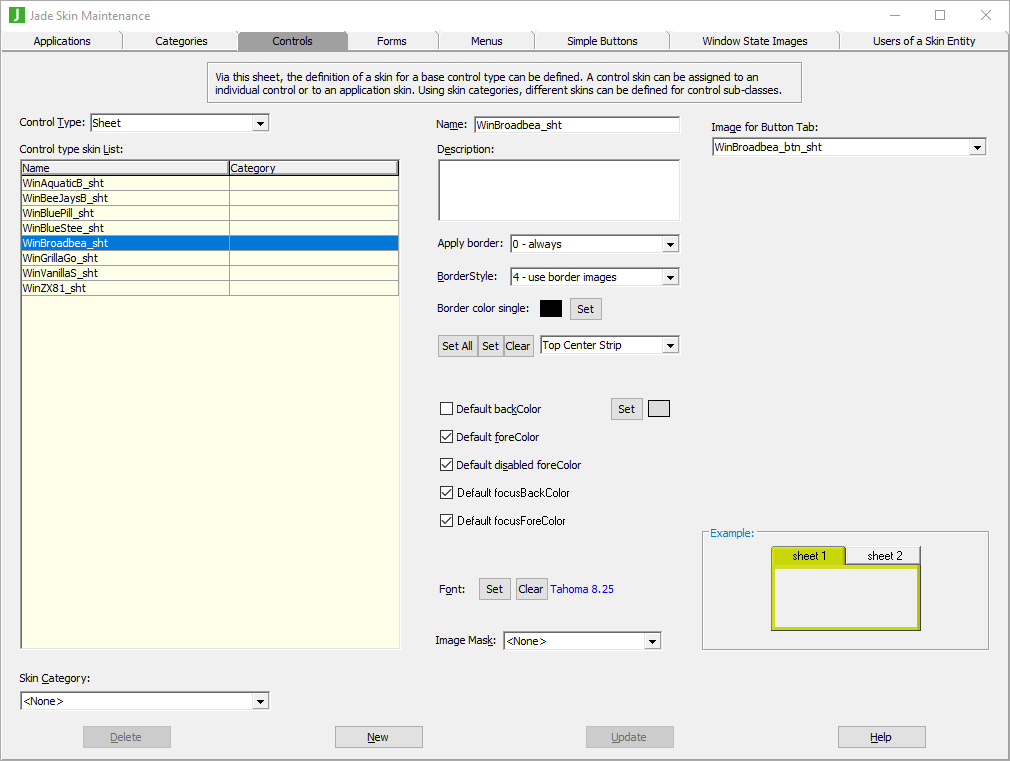 The list of controls skins for the Sheet control in then displayed in the Control type skin List table.