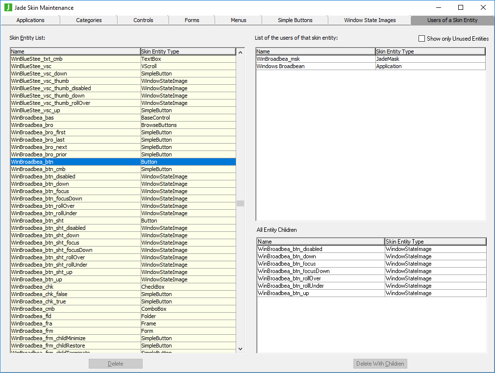 Delete with Children button on the lower right, which is enabled only if the selected skin entity is not referenced by any other skin element.