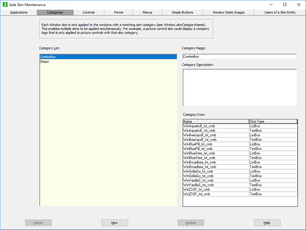 The Categories sheet, shown in the following image, is displayed when you select the Categories tab in the Jade Skin Maintenance dialog.