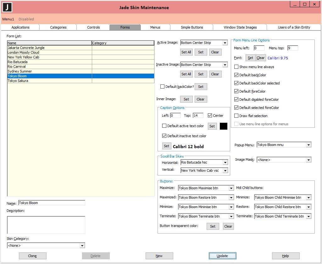 The Forms sheet, shown in the following image, is displayed when you select the Forms tab in the Jade Skin Maintenance dialog.