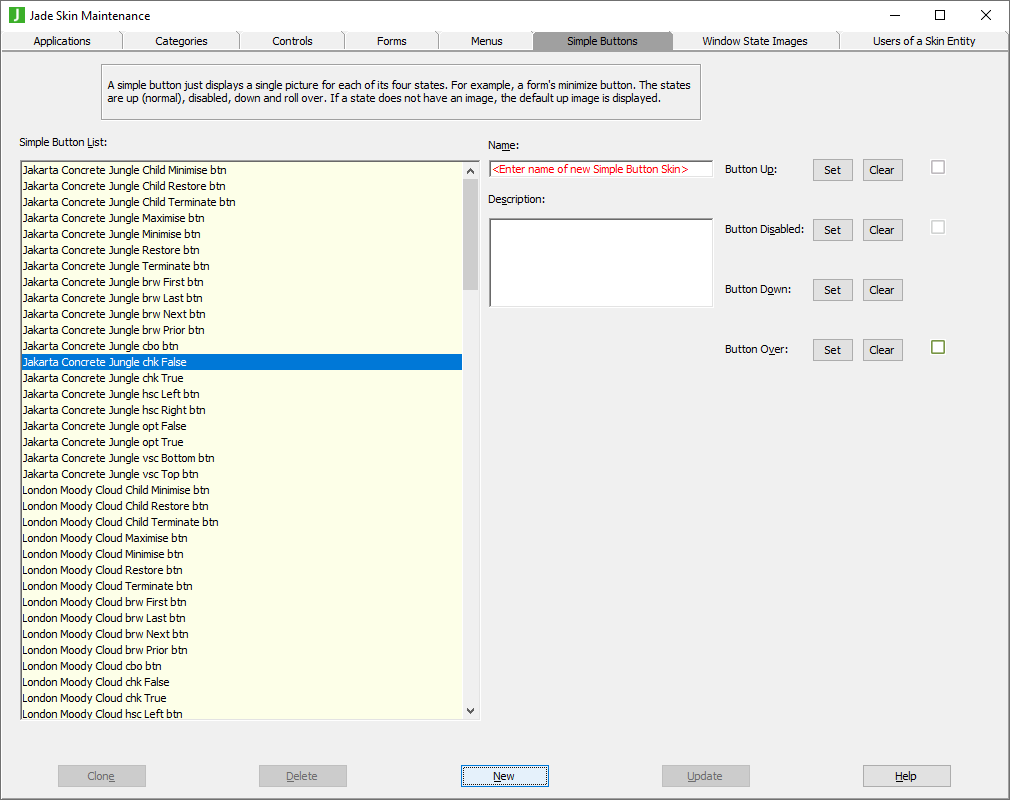 The Simple Buttons sheet, shown in the following image, is displayed when you select the Simple Buttons tab in the Jade Skin Maintenance dialog.