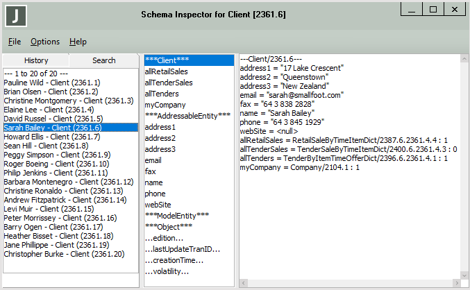 To inspect an object, click on an object listed in the lower part of the Object List in the center pane, to display details of that object in the pane at the right of the form.