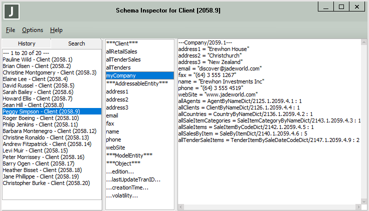 When the Use Same Window command is checked, each double‑click of an object in an Inspector form re‑uses the same form to display the selected object, replacing the previously displayed object. A pane at the left of the form contains a hierarchical list box displaying all of the objects that have previously been inspected. The hierarchy indicates the history of how the objects were inspected. The entries display the value of the name property if it exists in the object, followed by the class name and the Jade object identifier (oid). Clicking on an entry in the hierarchical history list displays the selected object again.