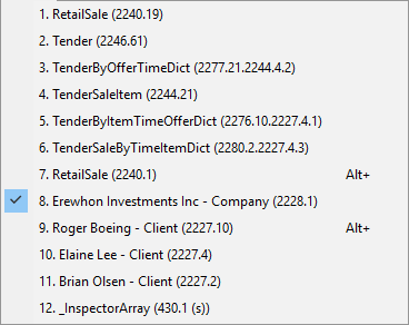 The History menu displays a check mark at the left of the object currently displayed in the Schema Inspector form (if it is in the menu item list).