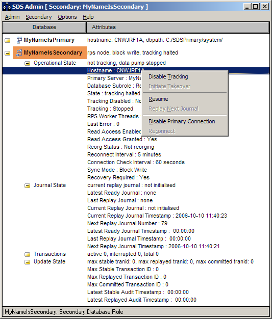 The SDS Admin secondary database view enables you to monitor a secondary database. The following image shows an example of the secondary database view in which the Secondary database node and the Journal State and Operational State entity nodes have been expanded.