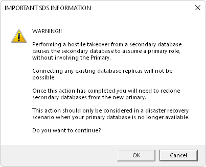If you initiated this action from a secondary database, click the OK button in the SDS warning message box if you are aware of the consequences of initiating the takeover of the primary role from the secondary database and you want to continue.