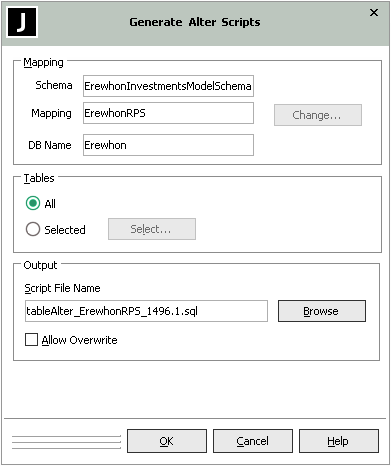 If you want an existing alter script overwritten, check the Allow Overwrite check box. As alter scripts are not overwritten by default, the generation of the alter script fails if a file exists in the output directory.