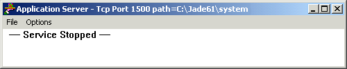 The Service Stopped status message is then displayed in the Application Server window and the File menu Start Service and the Options menu Run as Service commands are enabled.