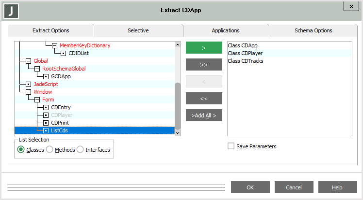 3. When all classes, interfaces, and methods that you want to extract from your schema are displayed in the selected objects list box on the right of the dialog, check the Save Parameters check box if you want your selected classes, interfaces, and class methods to be saved to a parameter file.
