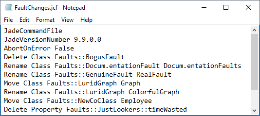 The command file, shown in the example in the following image, is created with a suffix of .jcf (Jade command file) in the location of the schema and forms definition files.