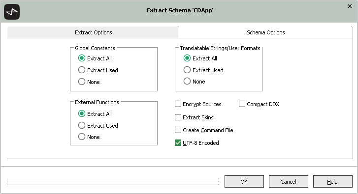 The Schema Options sheet of the Extract dialog is displayed when you have specified your extract options and you select the Schema Options sheet, to enable you to specify the parts of the schema that are to be extracted.