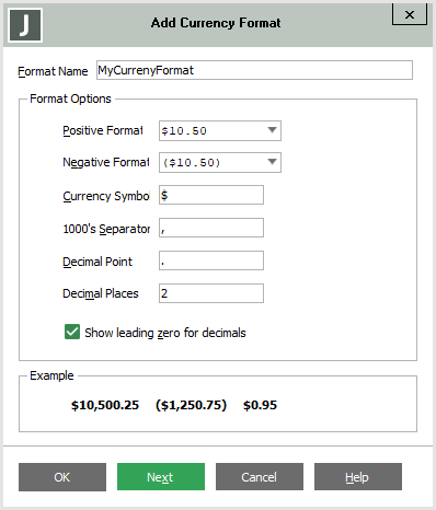 As you enter your format selections, an example of the currency in that format is displayed at the bottom of the dialog.
