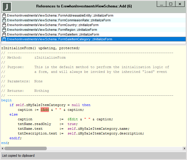The selected method is then displayed in the editor pane, with the string highlighted. You can maintain and compile methods displayed in the References window, if required.