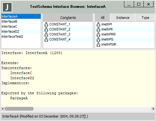 If you have not yet defined an interface in the current schema, nothing is displayed in the Interface Browser. When you select an interface, the editor pane displays all implementors in the current schema and all of its subschemas.