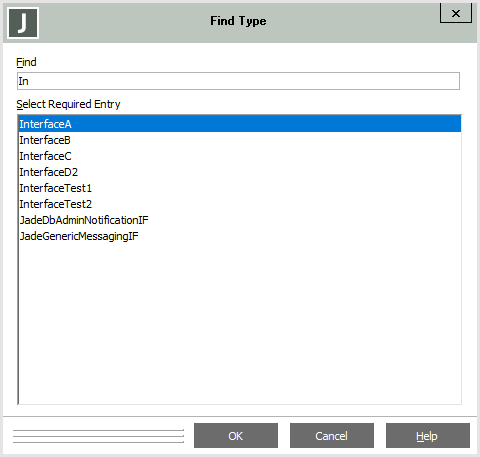 The Find Type dialog is then displayed, listing all available interfaces for classes in the schema from which you invoked the Interface Implementation Mapper dialog.