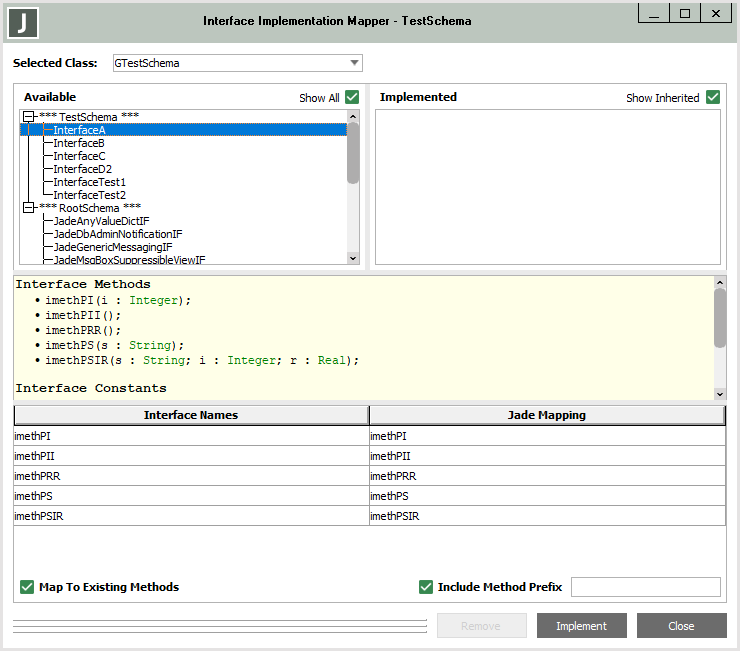 If you want to remove a method prefix from all Jade methods in the target class that are mapped to the interface, perform the actions in this step before you click the Implement button.