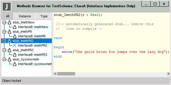 Although you can change a class method in the editor pane of this browser, to change an interface method displayed in the Methods List of the Methods Browser for interface implementors only, you can do so only from the Interface Browser.
