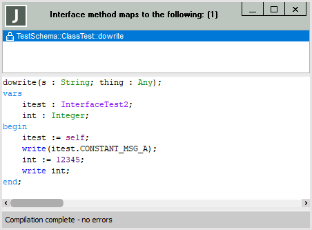 You can amend and compile a selected method, if required; for example, to automatically update the method signature when the signature of the interface method has changed. (For details, see "Compiling an Interface Method", earlier in this chapter.)