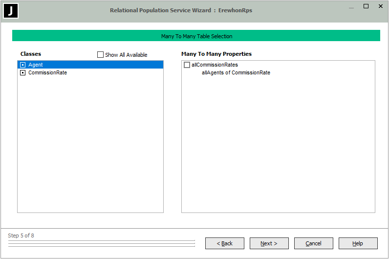 If you want to display all persistent classes in the selected schemas that have many-to-many collection mappings, check the Show All Available check box.